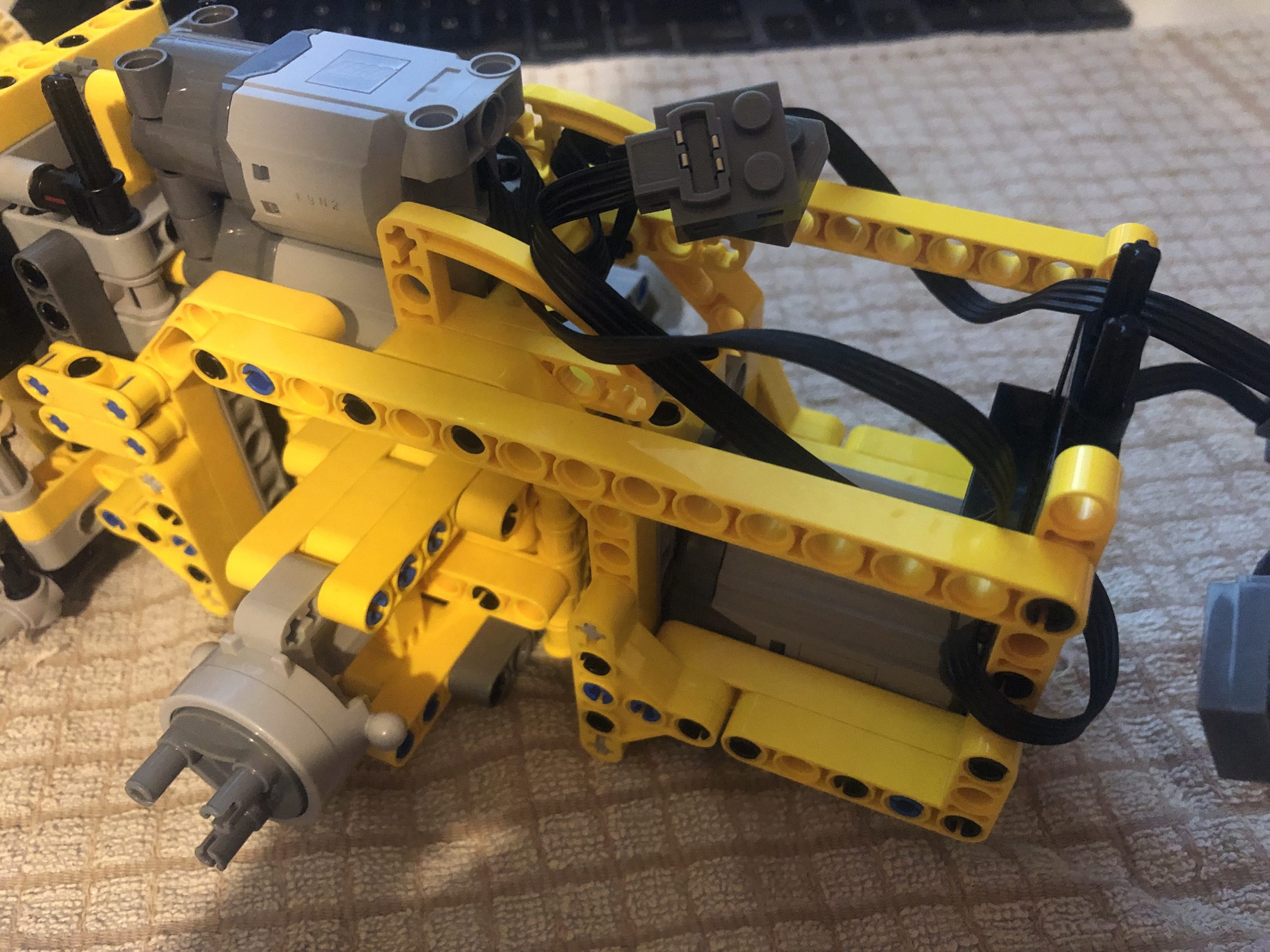 It was clear from the start that I had plenty of room within the main body for the four motors that were needed. My first task was to tackle the steering, which would be operated via mini linear actuators. I’d never built with these before and it took a few days to figure out how to get a basic steering system working. I initially tried to use the motor in a vertical configuration, but this was quickly abandoned as it took up too much space. I soon had a version of the steering mechanism that worked well, and during the first few weeks of work on the model, this was refined extensively. I decided to site the drive motor at the rear of the vehicle in order to provide a simple connection point for the 6-cylinder engine. This was simple enough to do, and before long I had a basic chassis that could drive, steer, and which had an engine with working pistons. The Lego Volvo hauler had recently been released, and I initially duplicated the crankshaft design from this model. My initial plan had been to use the Lego IR receivers and the physical remote (I’m not a huge fan of controlling vehicles via an app). However, adding the receivers AND a battery into the build proved difficult and I soon abandoned this idea in favour of using the BuWizz receiver. As this was also a battery box, I was able to save a considerable amount of space.