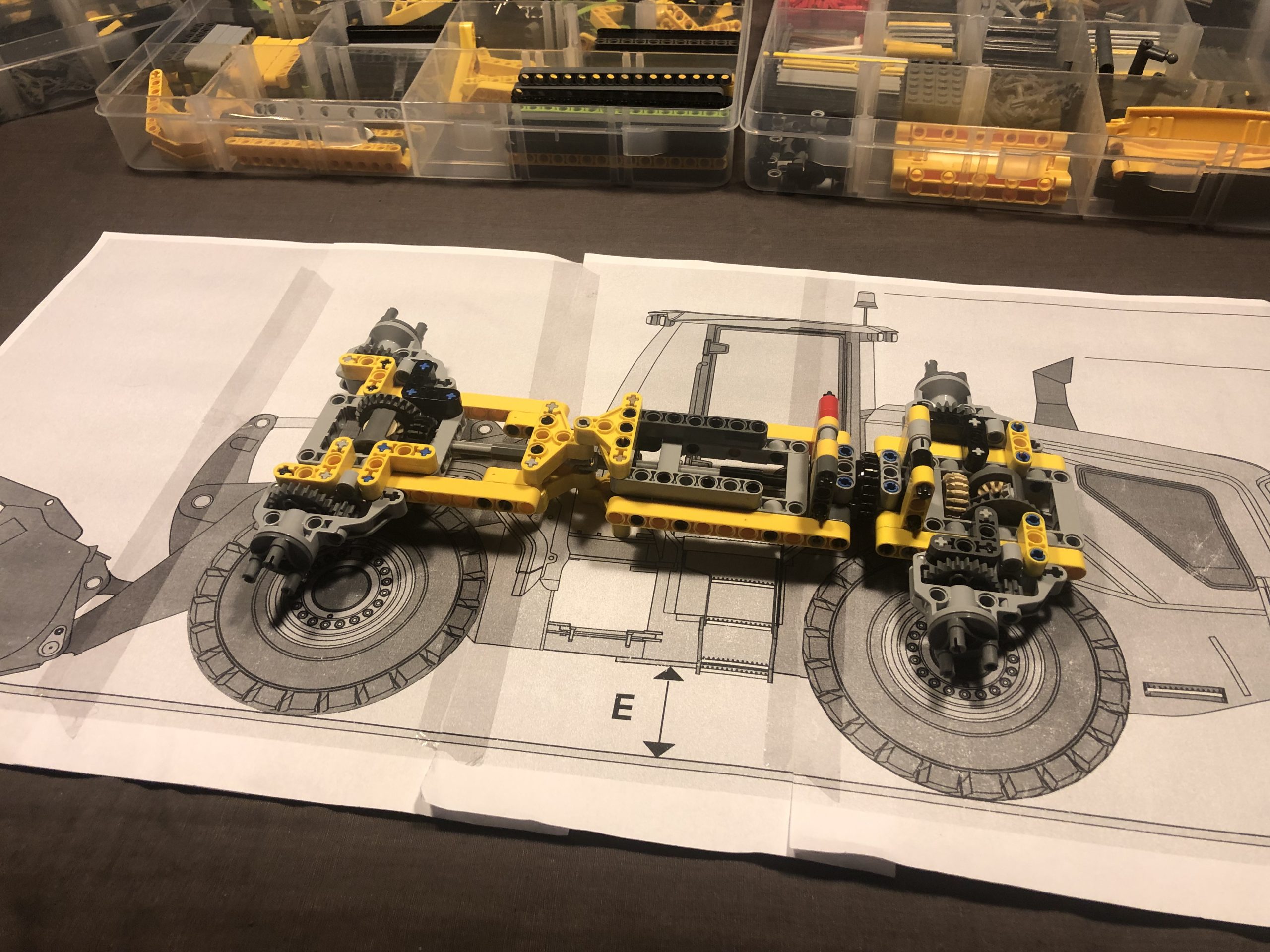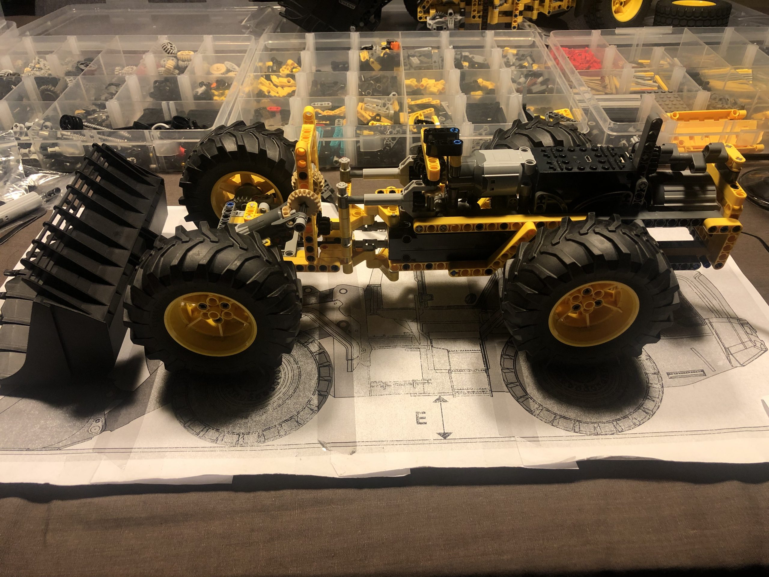 Once I’d decided which wheel loader to build (JCB offers many different shapes and sizes) I started – as I always do – with a printed schematic, scaled to the wheels that I had decided to use. At this size, the options are limited, and I opted for 23798 tractor tyres as I felt they looked better than the 92912 tyres that Lego used on their own Volvo wheel loader.