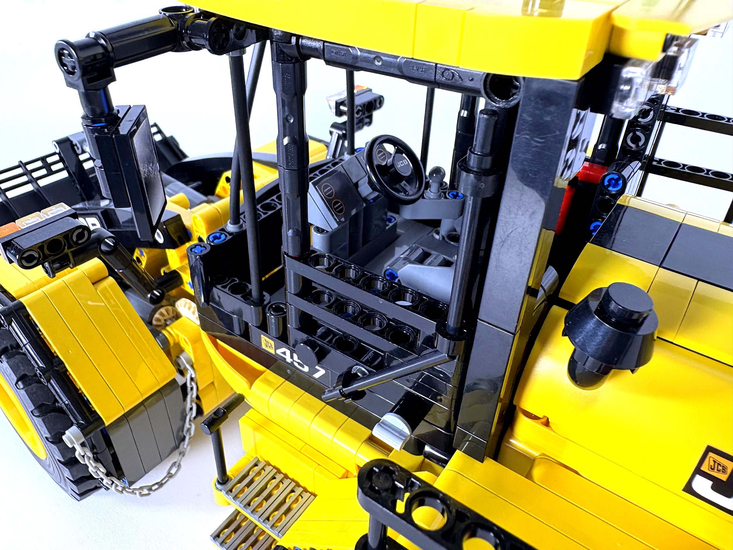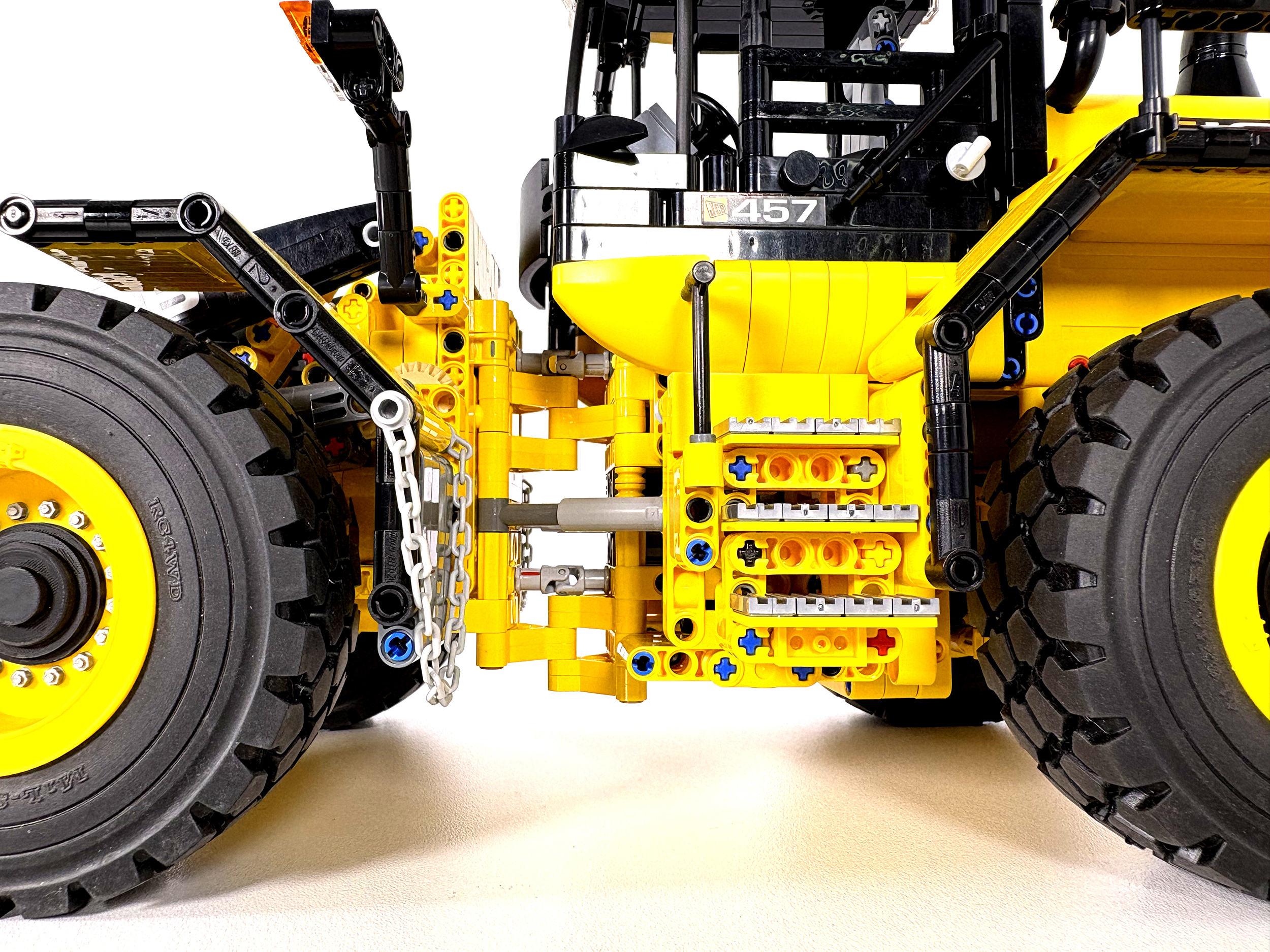 In the end I wasn’t able to get back to this model for almost ten months, but in the meantime, I’d been inspired by some other builds. Notable amongst these was Eric Trax’s excellent CADA dump truck. This model provided significant inspiration for a better way to implement the steering mechanism and also had a great design for steps up to the cab. With my existing model replicated in Stud.io, I decided to dismantle what I had and start again. This time everything went much better: within days I had a vastly improved chassis in place and the front loader was significantly better. For a while I experimented with including a motor in the front section (for bucket tipping), but when scaling against the schematic, there really wasn’t room for this – the JCB 457 has a significantly smaller front section when compared to other wheel loaders. Within a couple of weeks I’d refined the front part of the loader to the point where it was almost perfect: it functioned as it needed to and just needed some refinement in terms of how it looked.