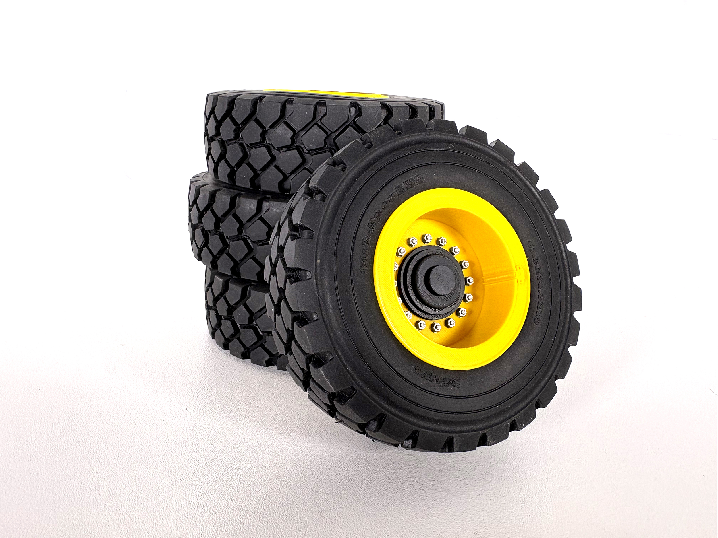 At this point, Eric Trax, a designer whose work I like very much, released his own wheel loader, based on a Doosan DL420-7. His model made use of non-Lego wheels and tyres, and this looked so good, I decided to do the same. The tyres were made for RC vehicles (can be found here) but fit well with certain Lego wheels. However, I contacted the builder of the custom wheels that Eric had used in his model and had him make the same for me, but in yellow. When these arrived, the model really began to take shape and started looking seriously good.